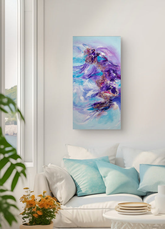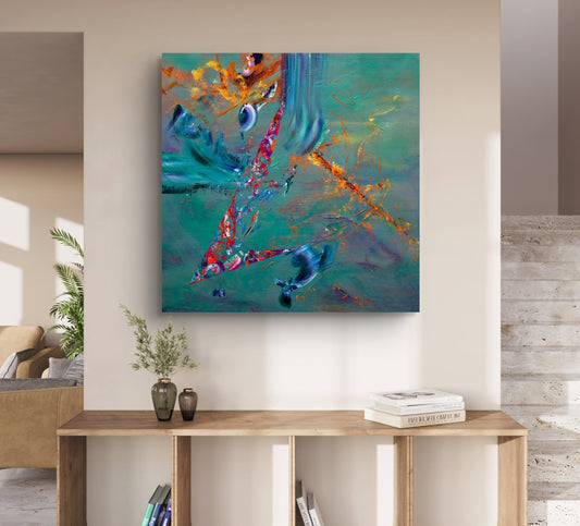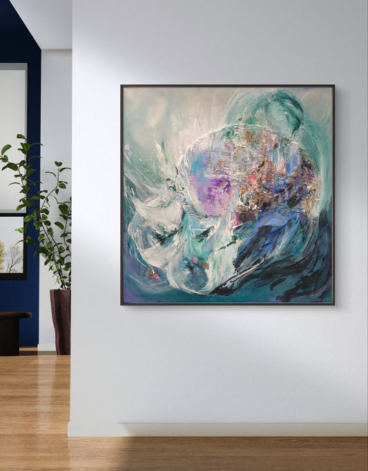 Working primarily with acrylic on large canvases, Senem integrates oil, mixed media, and textured materials to build rich, and layered surfaces. Cool, calming tones meet bold contrasts and vivid colour, sometimes accented with metallic and neon shades.