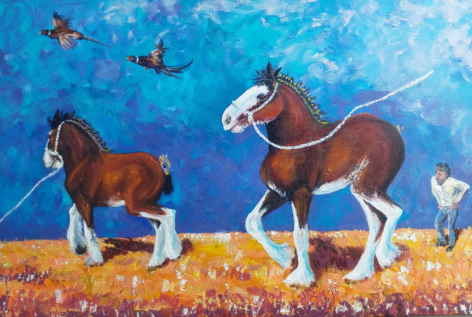 Oil and acrylic painting on a 36 by 24 inch deep edged canvas. This was meant to be a serious "ploughing match" painting....However,, I'd taken some photos of playful Clydesdales at a local horse show, and thought that this composition would be much more fun! I even had to ask my friend, Richard to pose as an irate farmer...and this is the result. Big and bold!