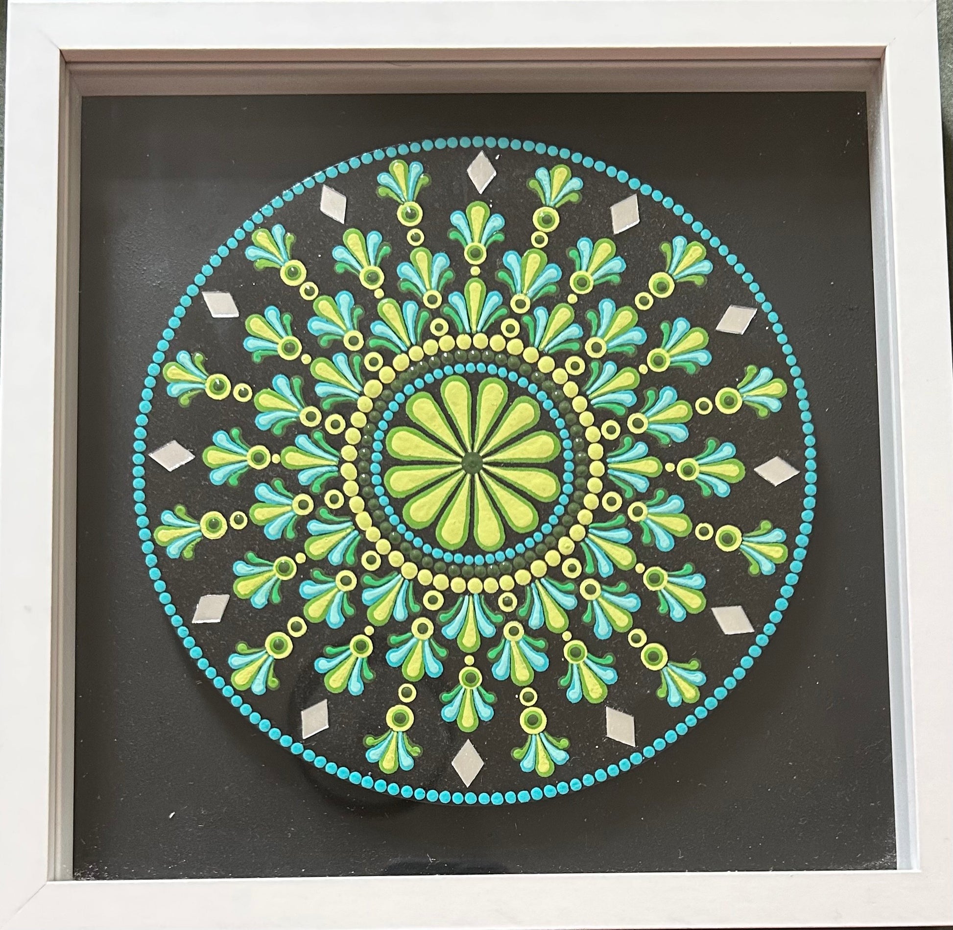 Painted with acrylic colours and embellished with tiny mirrors on a 20cm diameter circular wooden board. Placed in a square box frame of side 27cm.