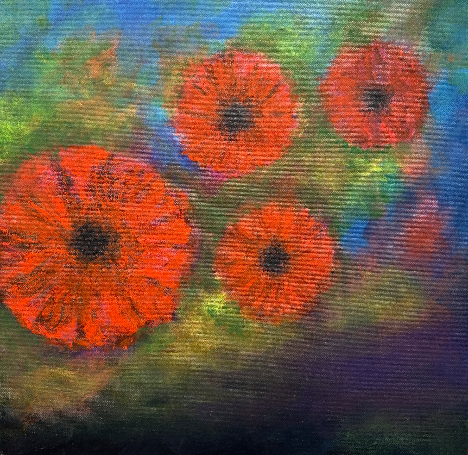 Four vibrant red flowers with dark centres are set against a textured background of green